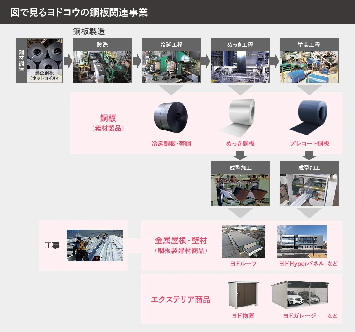 鋼板素材から、自社製鋼板を素材として製造する建材・エクステリア商品まで、一貫した生産体制で暮らしや街を支える様々な用途の製品を製造・販売しています。