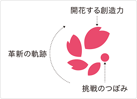 シンボルマークの持つ意味 当社が1950年代に鋼板のブランドマークとして採用し、社章として受け継いできた「桜」をモチーフとしました。小さなつぼみから花びらへと開花していく形状は、「成長」しながら「みらい」をひらいていく当社の決意を表しています。旋回しながら上昇する花びらの軌跡は、「創造力」と「挑戦」による可能性の広がりをイメージしています。