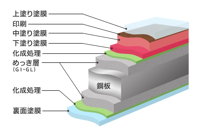 独自の鋼板印刷技術により、木目調、金属調、石目調などの模様を施した意匠性の高い鋼板です。