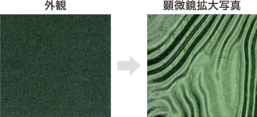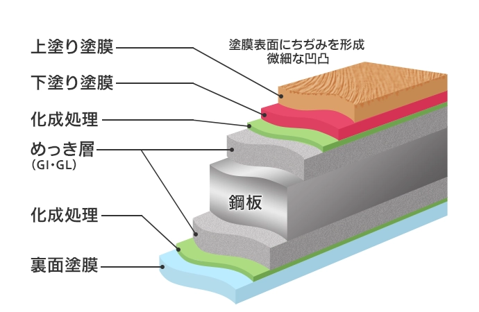 塗膜表面に微細なちぢみ(凹凸)を形成させ低光沢を実現。美しいマットな質感の意匠鋼板です。