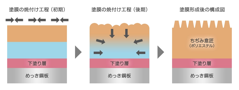 上塗り塗膜の表層と下層で焼き付け時の硬化速度を制御し微細な凹凸を形性、ちぢみ意匠を発現させます。