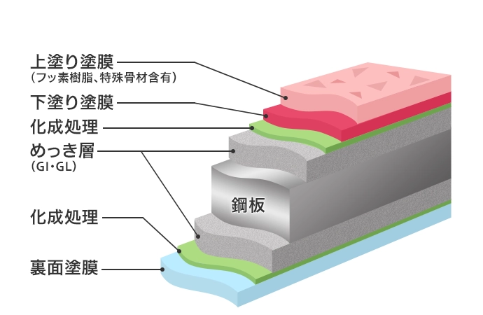 塗膜に配合した特殊骨材が優れた耐疵付性を実現し、厚膜のフッ素系樹脂塗膜により高い耐久性を誇る鋼板です。
