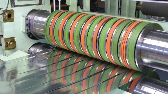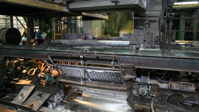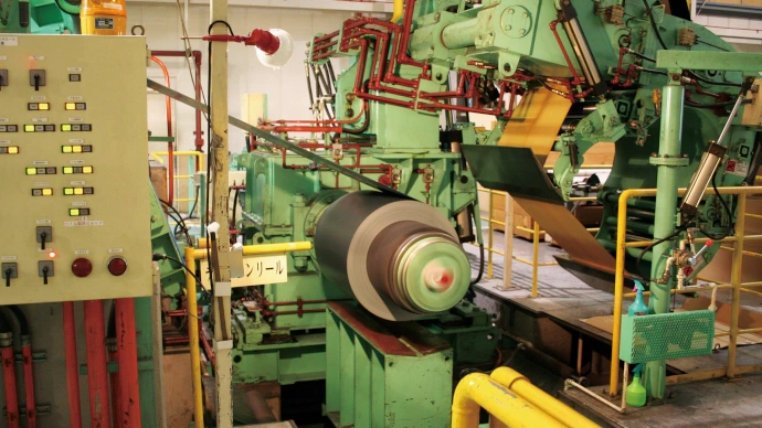 当工場の冷延工程は、原料となるホットコイル表面のスケール(いわゆる錆)を硫酸を用いて除去する「酸洗ライン」からスタートします。スケール除去後に「冷間圧延設備」で最大加圧約2,000トン、前後の巻き取り張力最大14.9トンを与えながら往復(レバース)させ、鋼板が所定の厚みになるまで圧延します。冷延工程を経た鋼板は、めっき鋼板や塗装鋼板の原板として使用されたり、19㎜~50㎜の幅にスリット加工後、重量物を結束するベーリングフープに使用されます。冷延工程は鋼板加工の出発点であり、全ての製品の品質の基礎がここで決まります。