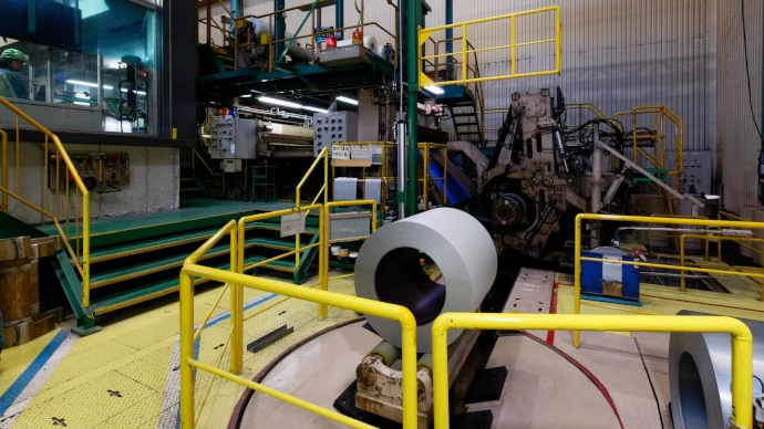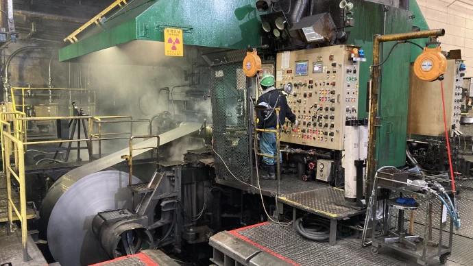 当工場の冷延工程は、原料となるホットコイル表面のスケール(いわゆる錆)を除去する「酸洗ライン」からスタートします。スケール除去後に「冷間圧延設備」で最大加圧約2,000トン、前後の巻き取り張力最大13.5トンを与えながら往復(レバース)させ、鋼板が所定の厚みになるまで圧延します。その後は製品によって異なりますが、圧延により硬化した鋼板を加工に適した材質にするため、「焼鈍設備」でコイルごと加熱した後、徐々に冷却するなどの工程もあります。冷延工程は鋼板加工の出発点であり、全ての製品の品質の基礎がここで決まります。