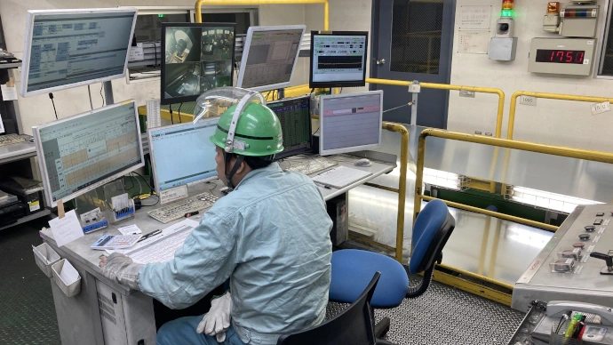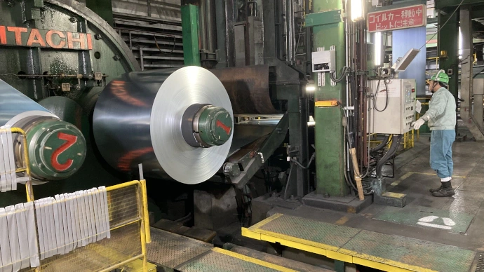 鋼板を錆から守る耐食性の他にも加工性・塗装性など求められる性能は多岐にわたります。当工場のめっき工程では、亜鉛めっき鋼板と55%アルミー亜鉛合金めっき鋼板の製造を行っています。原板となる冷延鋼板の投入から製品の取り出しにいたるまで、焼鈍温度・めっき付着量などを自動制御し、均一で高品質なめっき鋼板を製造しています。