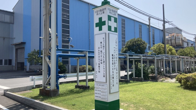 当工場では安全第一として指差呼称の励行はもちろんのこと、入社時の安全教育も徹底して行っています。その他、場内の安全パトロールやリスクアセスメント(設備や作業のリスク評価)なども計画的に実施し、毎日の労働災害ゼロを目指して日々活動しています。