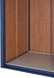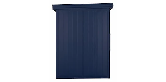 ガルバリウム鋼板製の中・大型物置「ヨド物置エルモ LMD-2215」をベースに、本体カラーには海をイメージしたブルーを採用し、扉と庫内には当社独自の木目調印刷技術を用いて森をイメージしたナチュラルウッドの色調を施しました。本体の外観だけでなく庫内にもこだわったデザインとなっています。