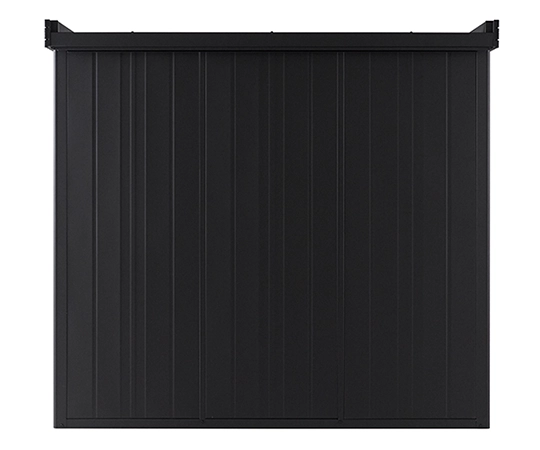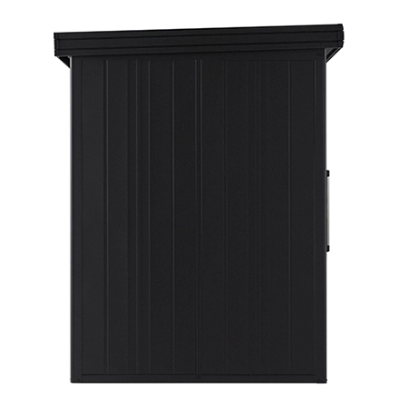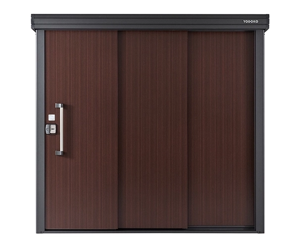 本体のブラック色は、「ヨド物置ブラックエスモ」と同じレザー調の塗装を施したマットな質感が特長です。扉色は2色で、本体と同色の「ブラック(BK)」または木目柄の「ショコラウッド(CW)」からお選びいただけます。扉色「ブラック(BK)」はブラックエルモ限定色です。